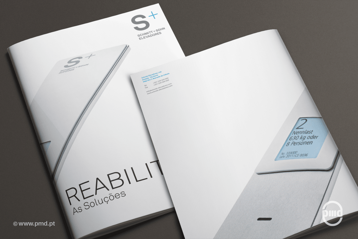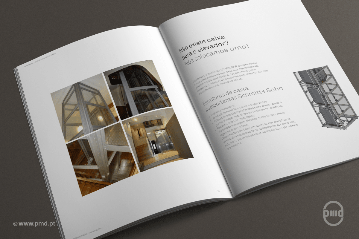 Criação do layout e paginação de Catálogo para a Schmitt Elevadores sobre as várias soluções que a empresa tem na área de Reabilitação de edifícios.